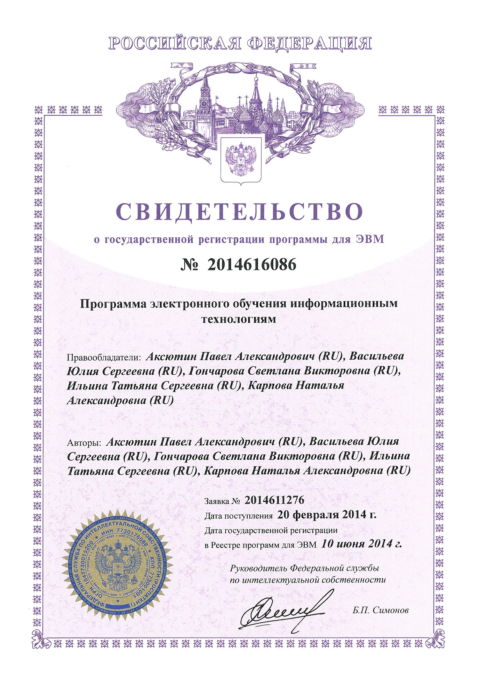 | 6 | 04.03.2015-24.04.2015 | 72 | Проектирование программ государственной итоговой аттестации бакалавров и магистров на основе технологий оценки компетентностей регистрационный № 4718, ФГБОУ высшего профессионального образования «Российский государственный педагогический университет им. А.И. Герцена», № 781800886502 |